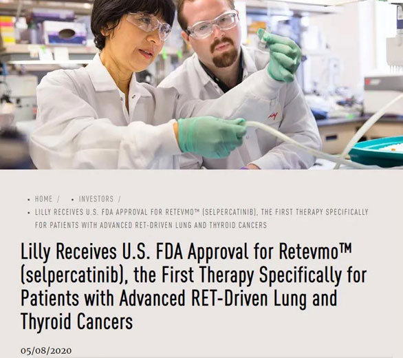 美國FDA批準(zhǔn)禮來(Lilly)旗下Loxo Oncology公司開發(fā)的高選擇性RET激酶抑制劑Selpercatinib(商品名:Retevmo,即LOXO-292)上市,用于治療轉(zhuǎn)移性、RET融合陽性的非小細(xì)胞肺癌(NSCLC)成人患者,需要系統(tǒng)治療(全身治療)的晚期或轉(zhuǎn)移性、RET融合陽性的甲狀腺癌成人和12歲以上兒童患者,以及需要系統(tǒng)治療的RET突變型甲狀腺髓樣癌(MTC)成人和12歲以上兒童患者。