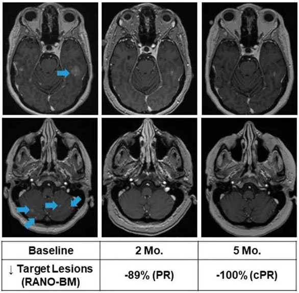 用藥2個月后,影像顯示腫瘤快速消退(RECIST為-57%)和多發(fā)性腦轉(zhuǎn)移的實(shí)質(zhì)性縮小或消退(RANO-BM為-89%),用藥5個月后,只殘留微小的非特異性增強(qiáng)灶,大腦中已沒有可測量的靶病灶,也就是說,腦部腫瘤消失了!