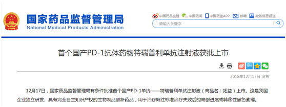 12月17日,國家藥品監(jiān)督管理局有條件批準(zhǔn)首個(gè)國產(chǎn)PD-1單抗--特瑞普利單抗注射液(商品名:拓益)上市,用于治療既往標(biāo)準(zhǔn)治療失敗后的局部進(jìn)展或轉(zhuǎn)移性黑色素瘤。