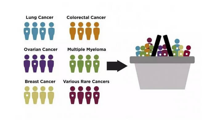 ▲一些不同類型的腫瘤患者具有相同突變(圖中白點表示),這些患者被分到相同的“籃子”測試同一種藥物。(圖片來源:Memorial Sloan Kettering Cancer Center)
