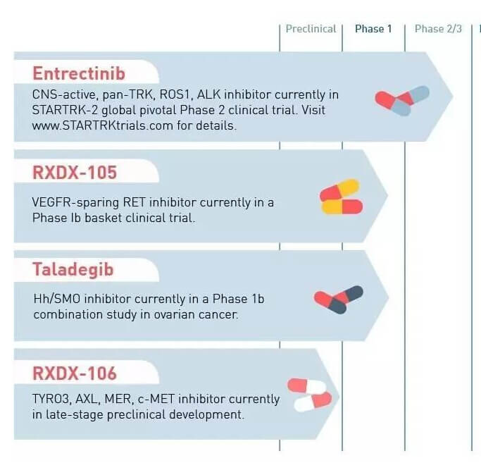 Ignyta公司主要研發(fā)精確靶向治療藥物,并且建立了分子診斷平臺對藥物進(jìn)行伴隨診斷測試,采用藥物/伴隨診斷戰(zhàn)略發(fā)現(xiàn)癌癥的分子驅(qū)動因素,迅速推進(jìn)治療藥物開發(fā)。Ignyta關(guān)注罕見癌癥患者未滿足的臨床需求,在研管線包括TRK,ROS1和ALK抑制劑,RET抑制劑等,這些突變發(fā)生在乳腺癌、膽管癌、結(jié)直腸癌、頭頸部癌、淋巴瘤、黑色素瘤、神經(jīng)內(nèi)分泌腫瘤等實體瘤中。