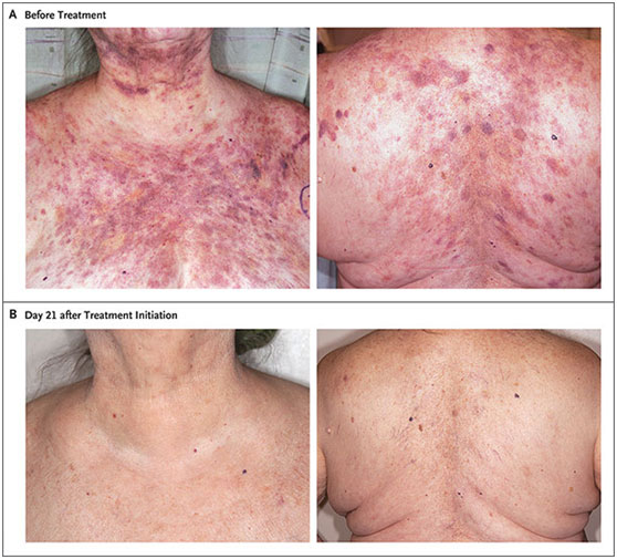 一名女性BPDCN患者使用tagraxofusp治療前后皮膚變化的照片。圖片來源:新英格蘭醫(yī)學(xué)雜志2019。