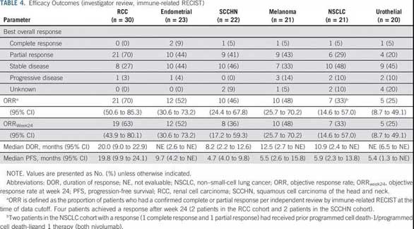 其中,腎細(xì)胞癌患者30例(22%),子宮內(nèi)膜癌患者23例(17%),頭頸部鱗癌患者22例(16%),黑色素瘤患者21例(15%),非小細(xì)胞肺癌患者21例(15%),尿路上皮癌患者20例(15%)